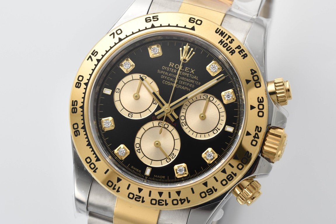 Bezel 18K yellow gold plated solid 904L stainless steel and Cu-W metal Bezel to increase watch weight to match the genuine gold watch weight