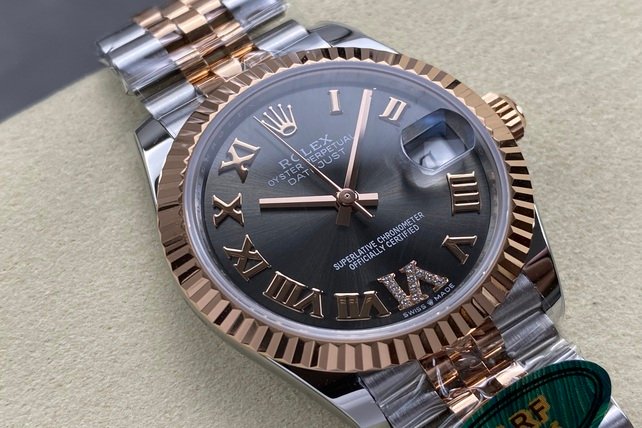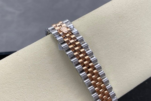 Strap: 18K rose gold plated, two-tone solid 904L stainless steel five-link bracelet with new Rolesor folding clasp