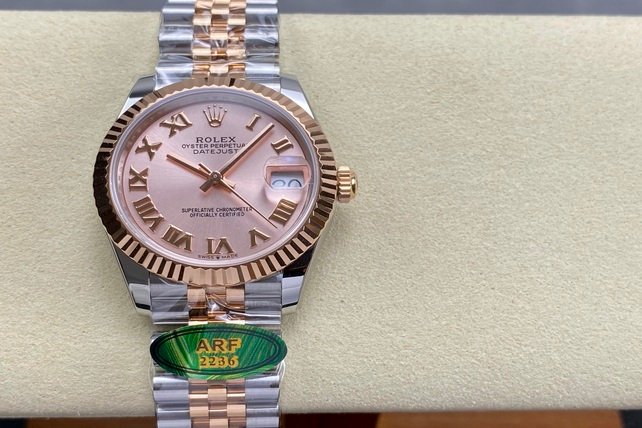 Strap: 18K rose gold plated, two-tone solid 904L stainless steel five-link bracelet with new Rolesor folding clasp