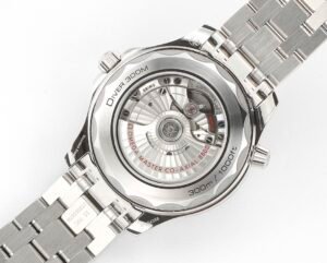 Movement Asian 2824 automatic movement decorated to Omega 8800 movement, black balance wheel, Same black balance wheel with four axis wave shape as genuine.